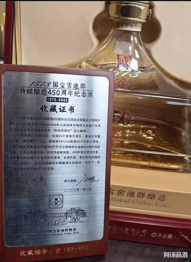 品鉴这款酒,个人觉得这款产品有很多故事,这些故事可能带来此酒是顶级国窖酒的误传。此酒产品上写着1573国宝窖池群,持续酿造450周年纪念,其实这款酒更多是因为纪念而做的酒。